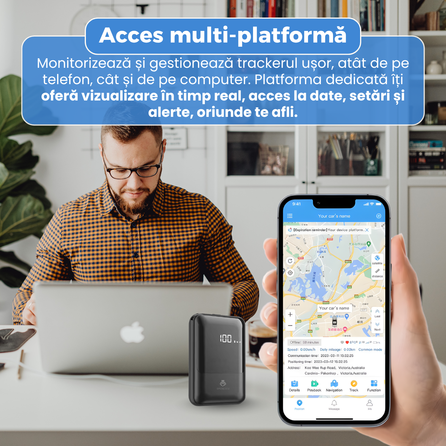 Trackerul P6 poate fi administrat atat de pe smartphone, cat si de pe computer. Aplicatia dedicata ofera harta in timp real, optiuni de configurare, rapoarte si statistici detaliate. Interfata intuitiva permite monitorizare usoara chiar si pentru utilizatorii incepatori.