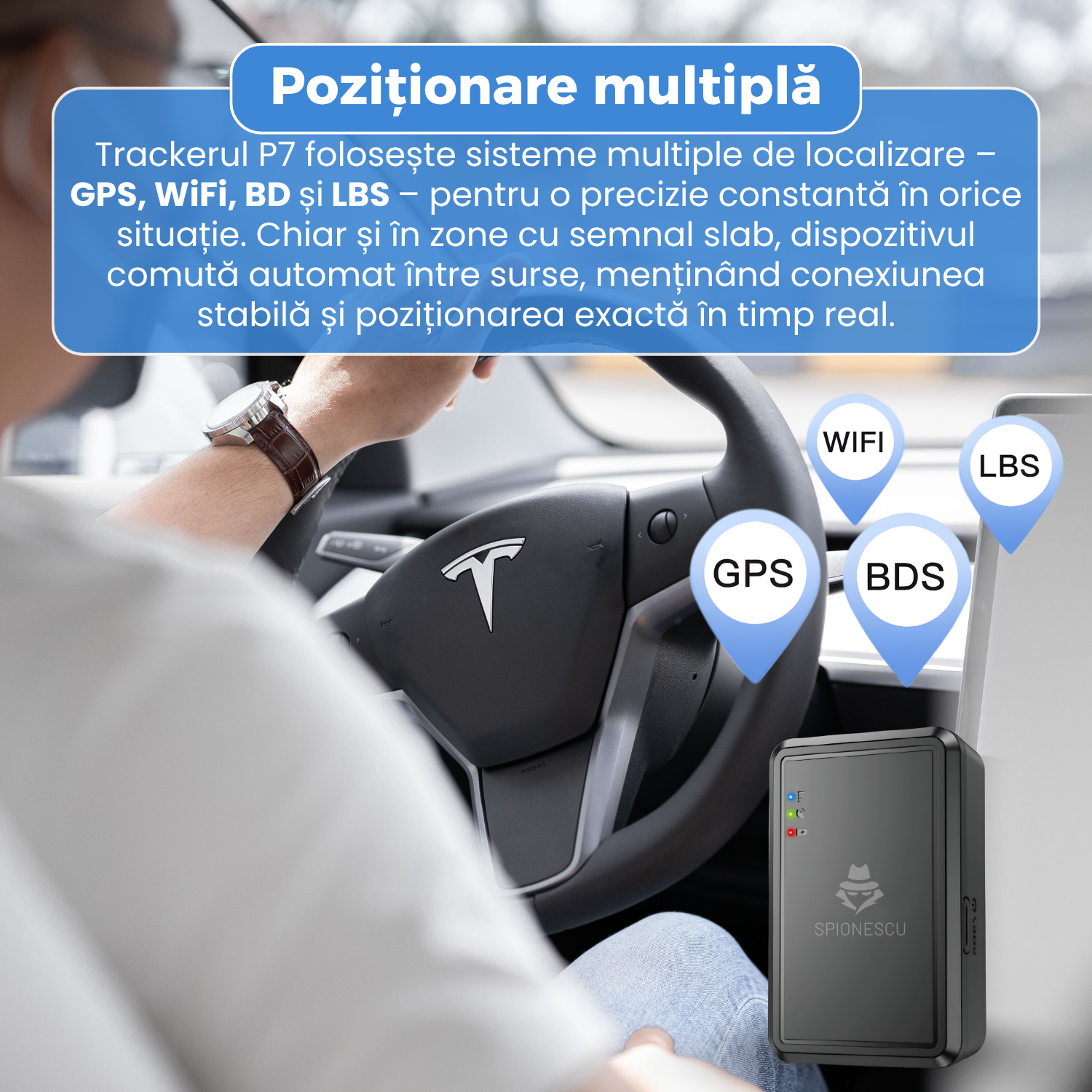 Sistemul P8 utilizeaza simultan trei metode de localizare: GPS, LBS si WiFi. Aceasta combinatie garanteaza o acuratete ridicata chiar si in locuri unde semnalul GPS este slab, cum ar fi garaje, zone urbane dense sau spatii inchise. Dispozitivul comuta automat intre metodele disponibile pentru a oferi cea mai precisa pozitie in timp real.