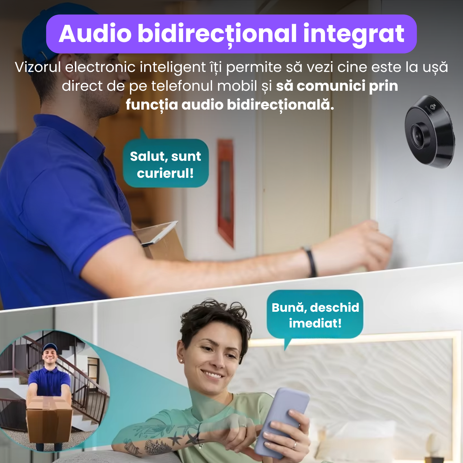 Vizorul inteligent iti permite nu doar sa vezi cine este la usa, ci si sa comunici direct cu vizitatorii, prin functia audio bidirectionala integrata. Indiferent daca esti acasa sau la distanta, poti vorbi cu curierul, raspunde musafirilor sau oferi instructiuni, totul prin aplicatia de pe telefon. Aceasta functie adauga un plus de confort si siguranta, permitandu-ti sa interactionezi cu cei din fata usii in timp real, fara sa o deschizi si fara sa fii prezent fizic.