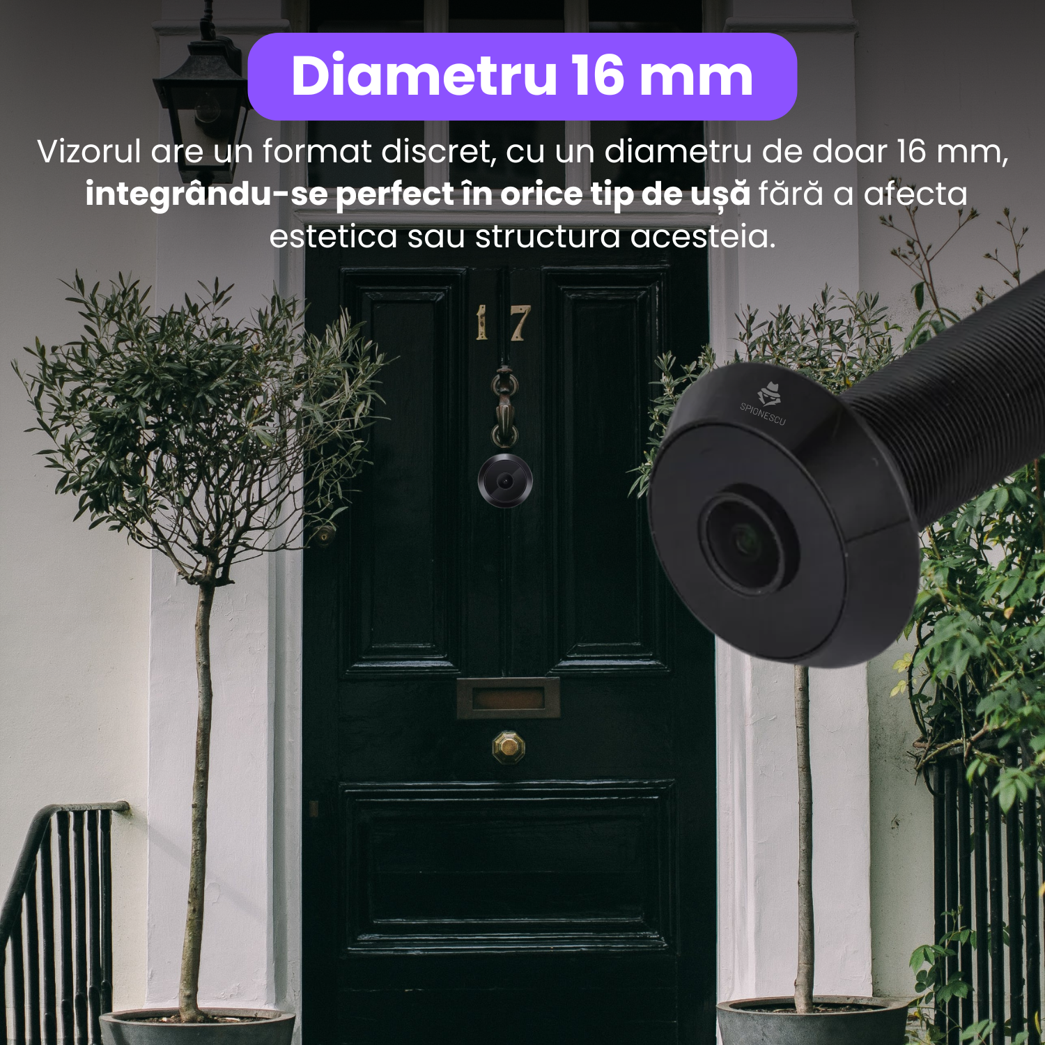 Vizorul inteligent are un format subtire si elegant, cu un diametru de doar 16 mm, ceea ce il face usor de instalat si aproape invizibil pe exteriorul usii.Se integreaza perfect in orice tip de usa, fara sa afecteze structura, aspectul sau designul locuintei tale. Datorita dimensiunii reduse, este ideal pentru cei care doresc un sistem de supraveghere eficient, dar care sa ramana discret si neobservat, oferind siguranta fara compromisuri estetice.